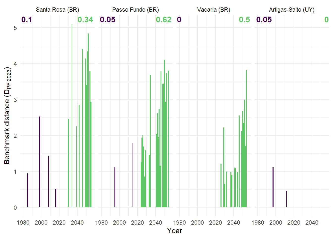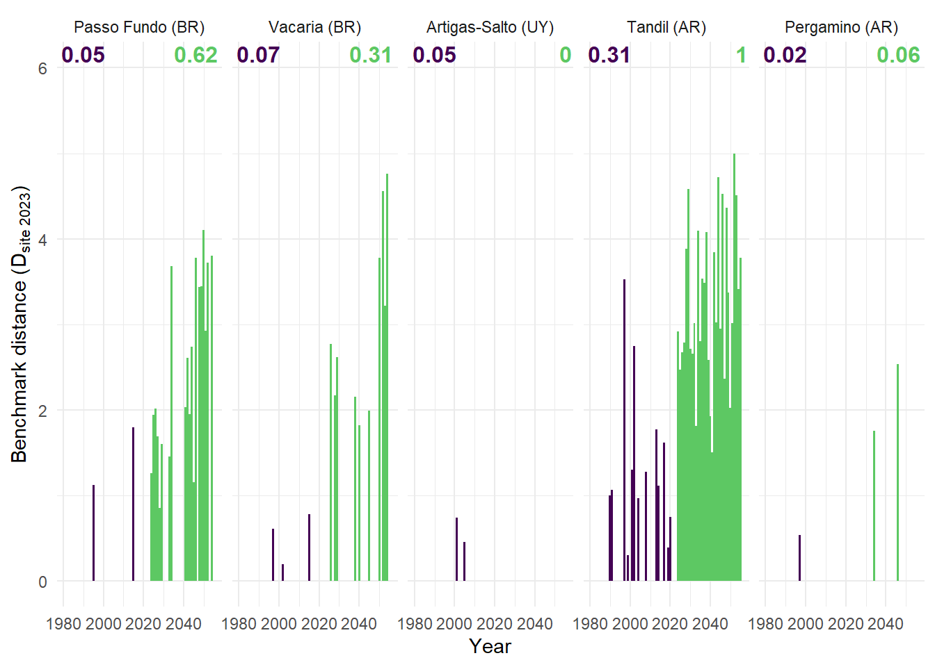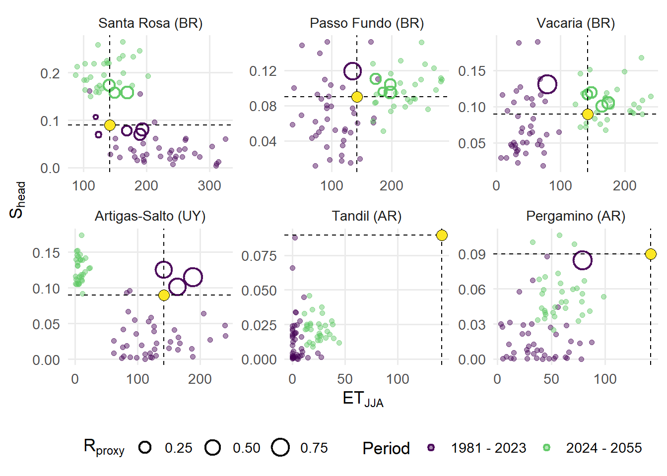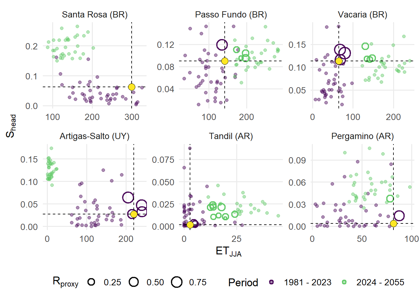 width = 8, height = 8, units = "in", dpi = 600)(A) Within-site bivariate distributions of yearly climate indices across six sentinel locations: Artigas-Salto (UY), Passo Fundo (BR), Pergamino (AR), Santa Rosa (BR), Tandil (AR), and Vacaria (BR). Points represent annual observations, colored by period. Colored rings represent years classified as analogs, with size corresponding to the Rproxy value. The x axis shows winter thermal exceedance (ETJJA), while the y axis shows heading-period thermo-hydric suitability (Shead).