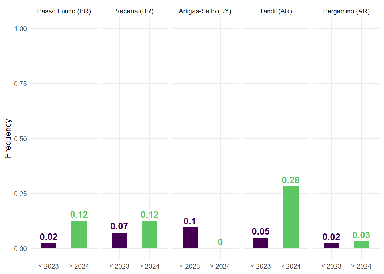 A set of sentinel sites was defined to represent key wheat-growing regions across southern Brazil, Uruguay, and Argentina, capturing a broad latitudinal and climatic gradient. For each location, geographic coordinates and a site-specific temporal window corresponding to the wheat heading period were specified. These periods are defined using fixed calendar dates and subsequently converted to day-of-year format to facilitate alignment with daily climate data.